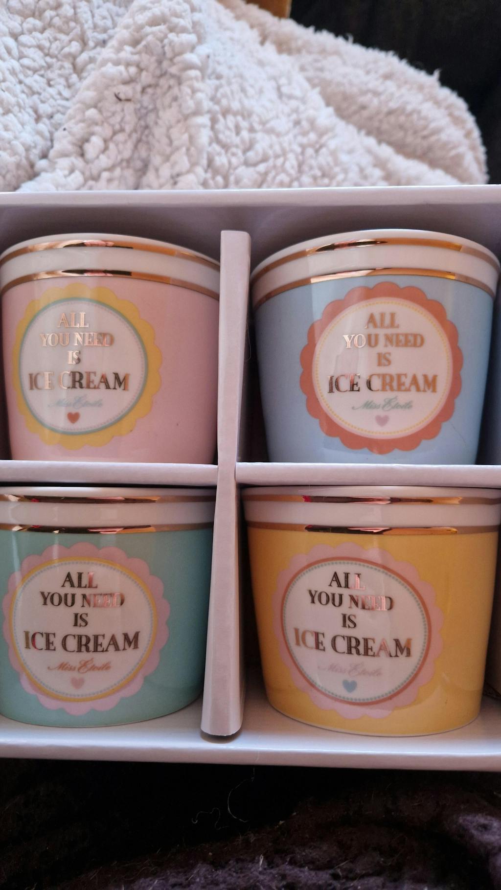 - Beskrivelse: 4 x ice cream koppe + 4 teskjeer